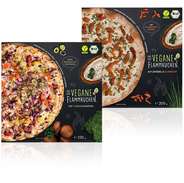 Uns war es wichtig, dass Der vegane Flammkuchen bio ist und somit auch seinen Teil in Sachen Nachhaltigkeit beiträgt. Auch bei der Verpackung haben wir die nachhaltigste Möglichkeit gesucht. Deshalb ist unsere Verpackung aus recyceltem Karton hergestellt und die Tinte dafür haben wir ebenfalls nach hohen Standards ausgewählt. Damit unser Flammkuchen frisch bleibt, benötigen wir eine sogenannte Schrumpffolie. Wir verwenden die Stärke 10 µm. Das ist im Vergleich zu anderen Schrumpffolien schon wenig Plastik. Es werden mittlerweile auch 7 µm starke Schrumpffolien, die aber noch in der Entwicklung sind und somit aktuell mehr Müll verursachen als die 10-µm-Schrumpffolien. Auch abbaubares Plastik gibt es derzeit nur als Hartplastik, aber wir suchen aber weiter nach Alternativen und halten euch darüber natürlich auf dem Laufenden.