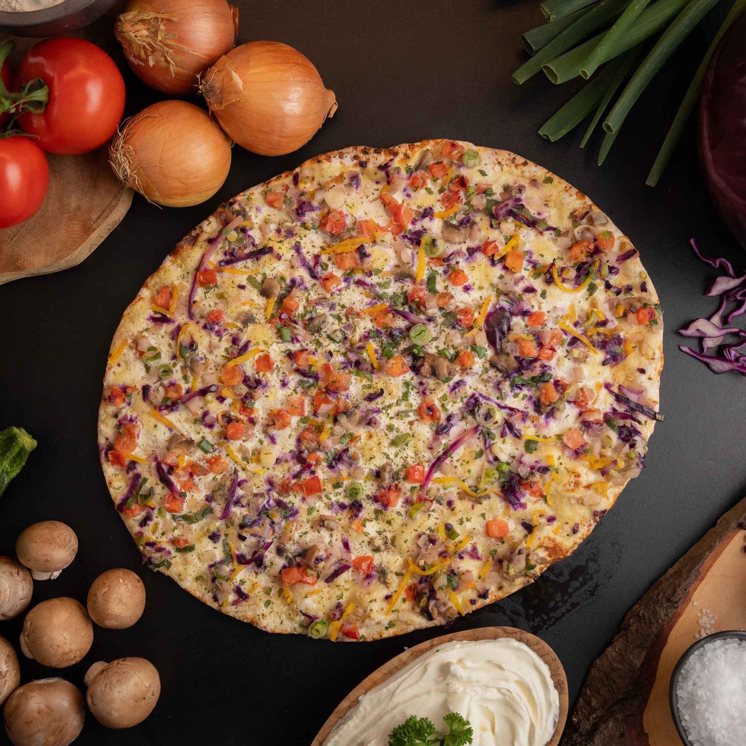 Unser Flammkuchen mit 7 Gemüsesorten vereint einen hauchdünnen Boden mit einer cremigen Basis und einem sorgfältig abgestimmten Mix aus sieben Gemüsesorten. Beim Backen entwickeln sich feine Röstaromen, das Gemüse bleibt saftig und sorgt für eine frische, herzhafte Note.